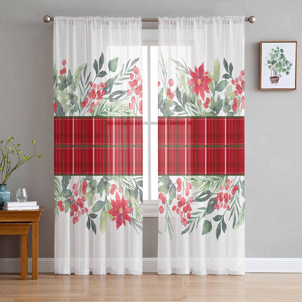 Christmas Plants Leaves Berries Flowers Sheer Curtains Modern Gauze Curtain for Living Room Bedroom Voile Yarn Curtains