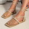Fashion Women's Baotou Sandals Fall New Square Head Rhinestone Mesh Bag with Hollow Cross Lace-up Flat Shoes