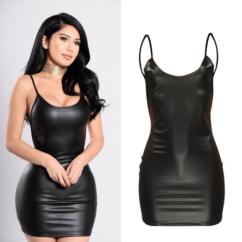 Rochie de vară fără spate cu luciu ridicat, cu piele lăcuită moale și fustă elastică cu drapaj pe șold, cu bretele