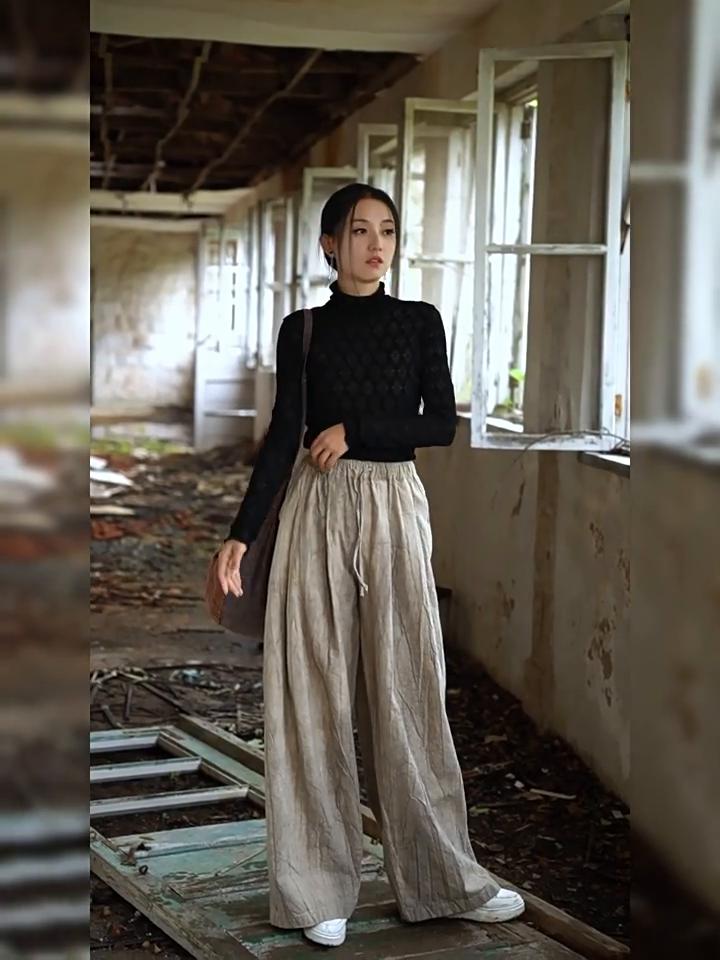 Johnature Pantaloni ocazional pentru femei cu picior largi Pantaloni cu vopsire în talie elastică Buzunare de toamnă Curea Pantaloni lungi