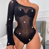 Women's Rhinestone Fishnet Sheer Bodysuits Sparkly Mesh Lingerie Hollow Out One Sleeve Club Bodystocking