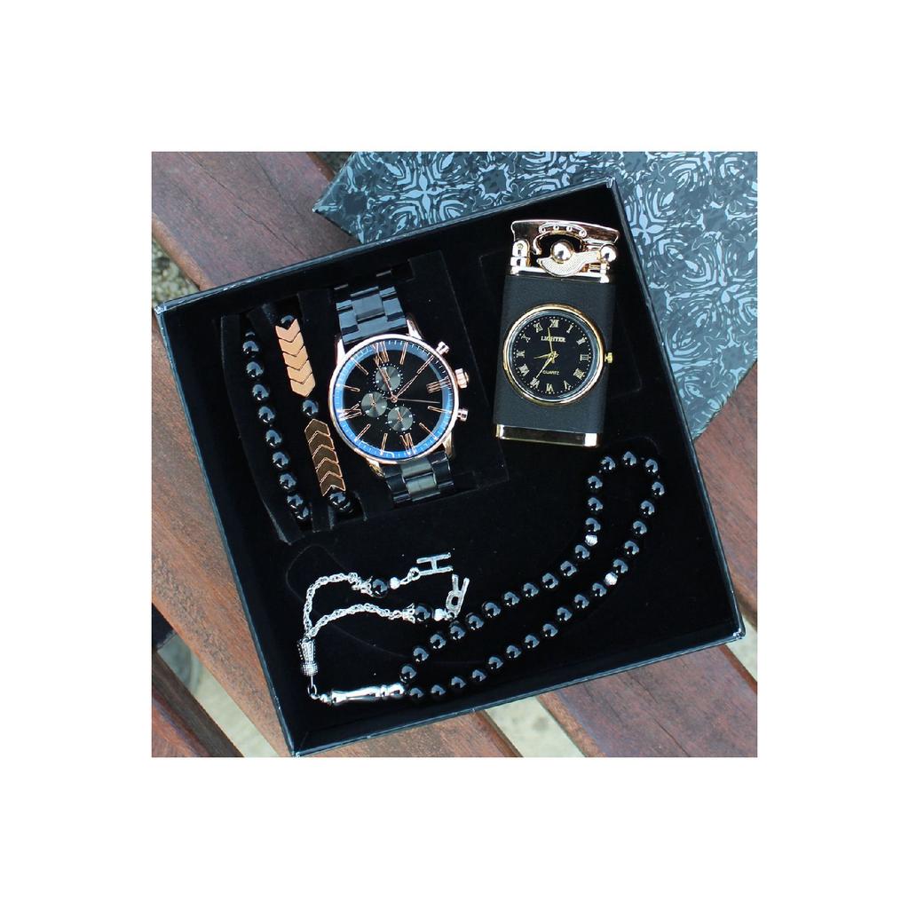 Steel Strap Men's Wristwatch Set Men's Rosary "clock Lighter Illuminated" Bracelet Sports Watch Set