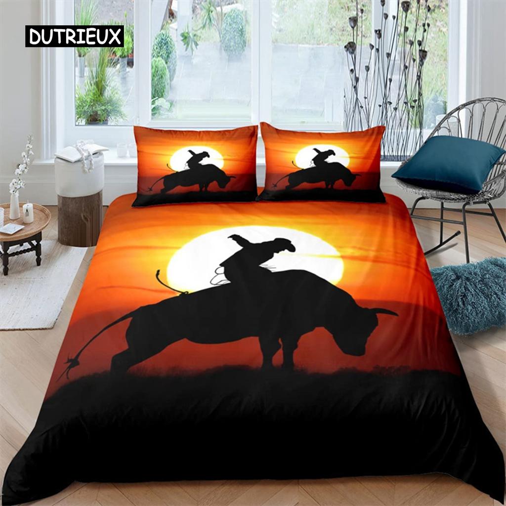 Western Cowboy Duvet Cover Rodeo Cowboy Riding Bull Horse Bedding Set Full For Boys Teen Microfiber Farmhouse Style Quilt Cover
