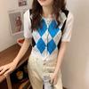 Cardigan cu mânecă scurtă și Palton mic pentru Femei Vară Stil Nou Retro Stil Colegial Romboși Contrastanți Tricotat Subțire Top Scurt
