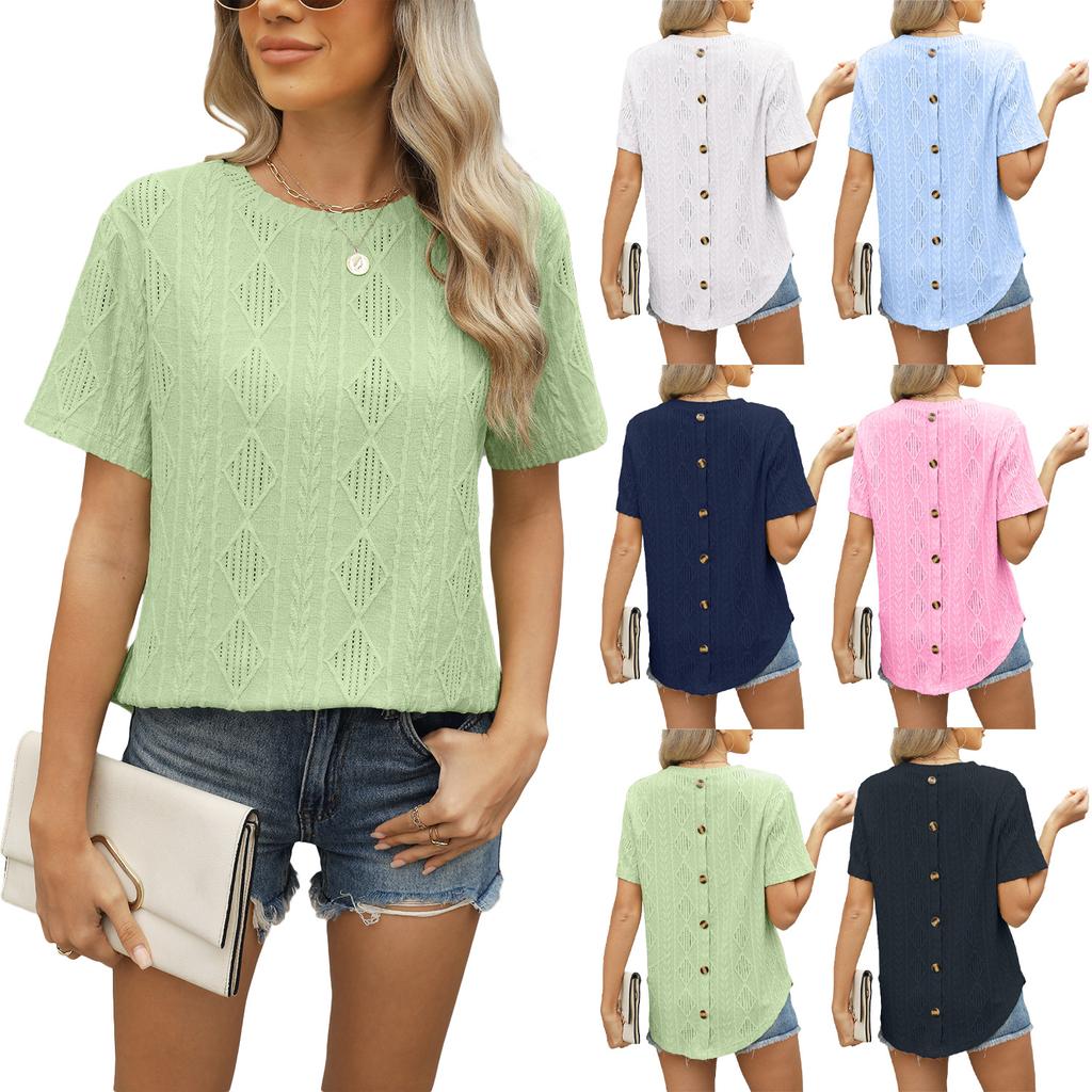 Summer Short Sleeve O Neck Solid Color Button Breathable Casual Women Pullover T Shirt Blouse Top