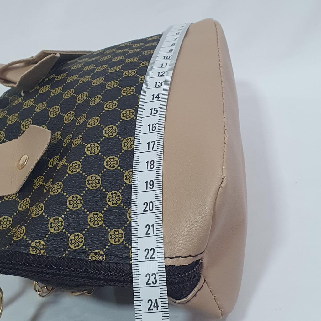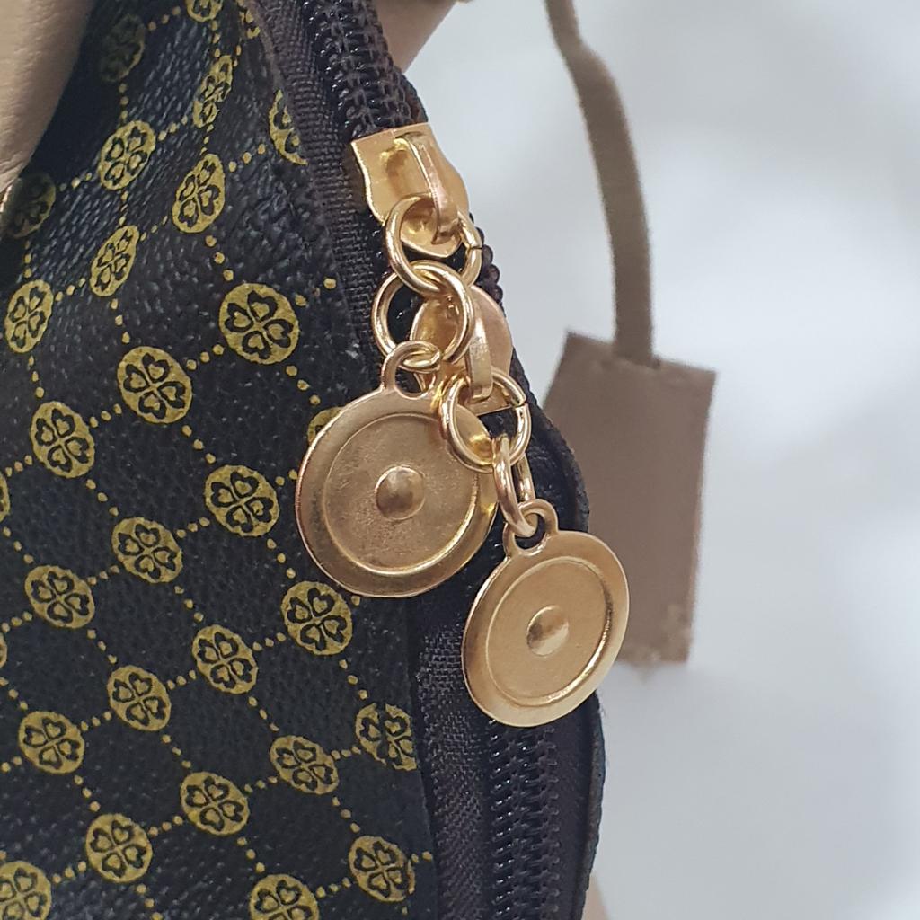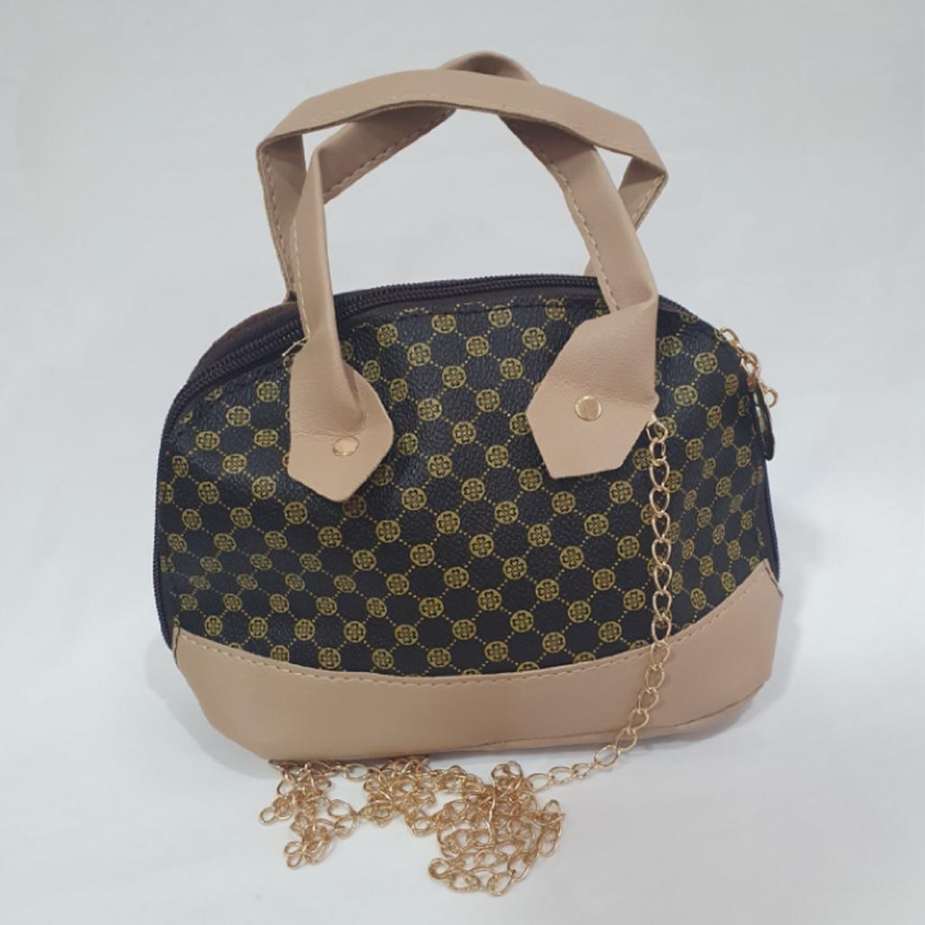 Geanta de mana comoda si draguta. Dimensiune 19 x 15 cm. Toate lucrurile mărunte ale doamnelor se potrivesc. Culoarea este cool, de marcă. Pe pereții din față și din spate există o inserție din alt material, roz. Pe fundalul principal există un imprimeu sub formă de monograme ale unei mărci bune.. Manerele sunt si ele roz, sunt nituite pe geanta.. Geanta se inchide cu fermoar. În interior există un singur compartiment, fără căptușeală. Garniturile sunt de o culoare aurie frumoasă. În loc de curea, există un lanț de o culoare aurie plăcută. Trebuie introdus în orificiile de pe geantă în sine; există cârlige speciale pe lanț.