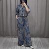 Seturi 2 Piese Femei Imprimeu Vintage Primăvară Decolteu V Mânecă Lungă Cămașă cu Șireturi Pantaloni Largi Ținută Vară Nasturi Costum 2 Piese