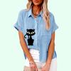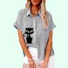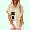 Plus Size Women Casual Short Sleeved Linen Top Fashion Cat Print T-shirt Ladies Loose Buttoned Blouse