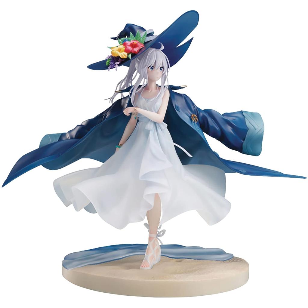 - **Profil lateral captivant, privind în depărtare** Părul ei, ciufulit ușor de briza mării, și privirea ei fixată dincolo de ocean, emană o frumusețe încântătoare. **Pălărie și halat de vrăjitoare detașabile** Împodobite cu flori colorate, pălăria vrăjitoarei și halatul drapat pe umeri sunt detașabile, permițându-ți să-i admiri coafura și rochia cool în întregime.
