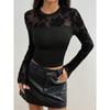 Tricou cu mânecă lungă cu mânecă lungă, cu îmbinare din dantelă, de culoare solidă, pentru femei