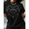 Tricou de vară pentru femei, de stradă, lejer, cu gât rotund, tricou cu mâneci scurte, tricou negru, cu model de flori, imprimat la modă
