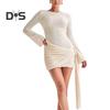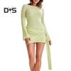 Detaliu elegant: Prezentând un decolteu rotund, mâneci lungi și un design cu tiv înnodat, această rochie oferă un aspect vizual stratificat, care este atât șic, cât și la modă.. Elasticitatea tricotată asigură o potrivire confortabilă care îți accentuează curbele.