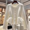 Cardigan tricotat dulce cu mânecă lungă, cu volane în talie și decolteu rotund franțuzesc, pentru toamnă/iarnă.