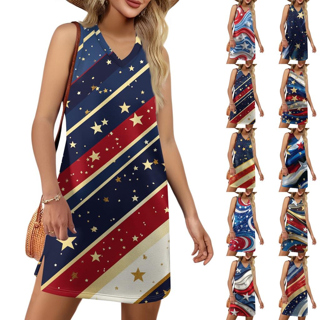 Rochie de vară casual de plajă cu gât în V pentru femei, fără mâneci, cu imprimeu de Ziua Independenței