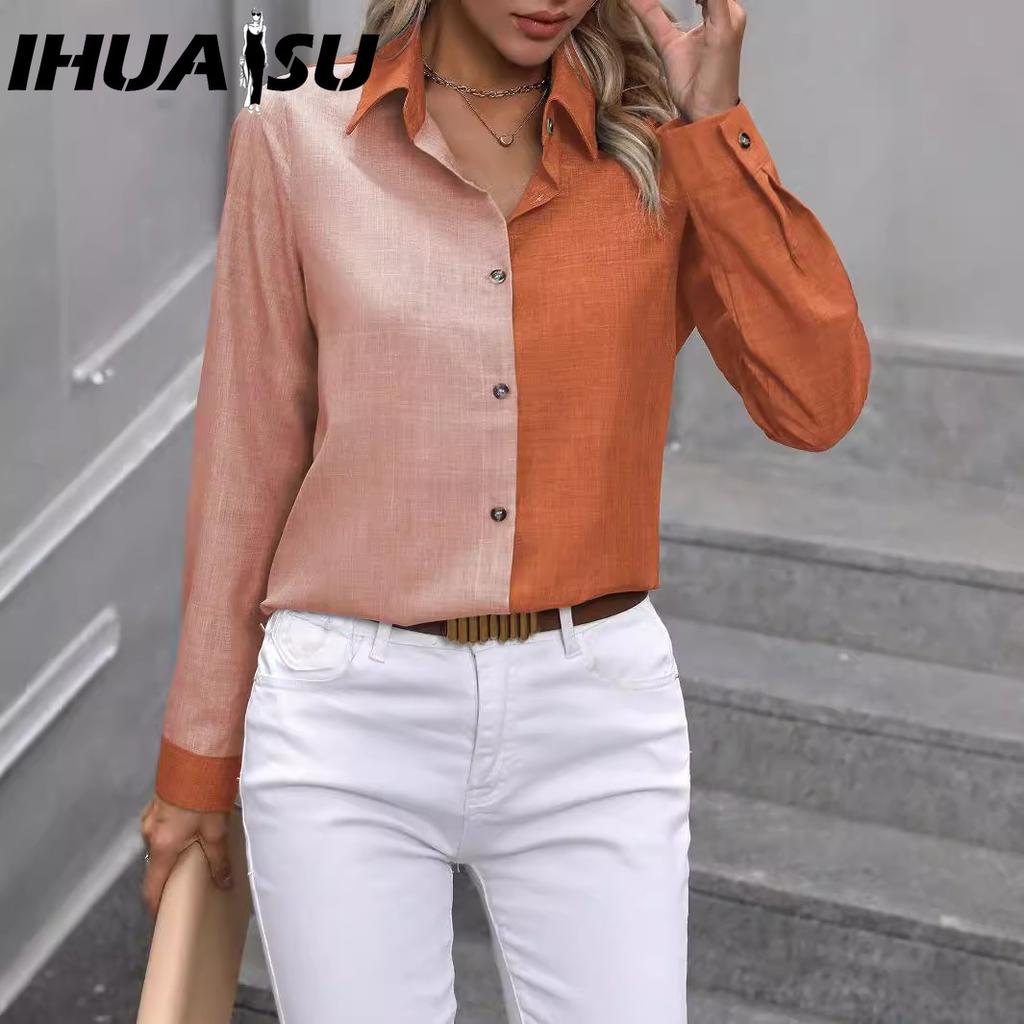 IHUASU Spring Summer Casual Single Breasted Solid Color Matching Color Long Sleeve Lapel Shirt for Women
