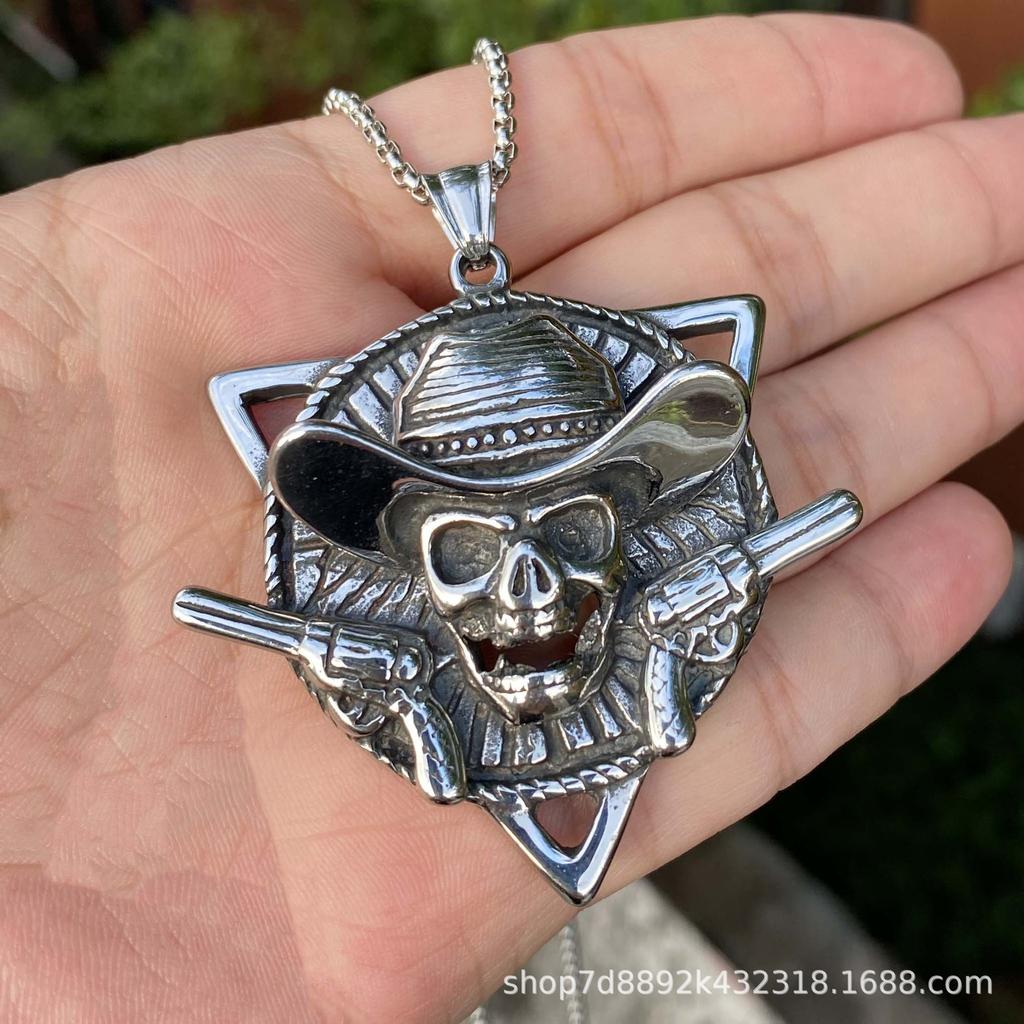 Halloween Double Gun Stainless Steel Skull Pendant Personality Punk Necklace Vintage Trendy Men'S Necklace Pendant Sweater Chain
