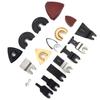 19 x lame de ferăstrău drepte1 x lamă semicerc din aliaj1 x lamă triunghiulară din aliaj1 x lopătă1 x racletă1 x placă de nisip triunghiulară1 x placă de nisip pentru degete1 pungă Hârtie abrazivă triunghiulară(30pcs)1 sac de șmirghel(30pcs)2 x garnituri