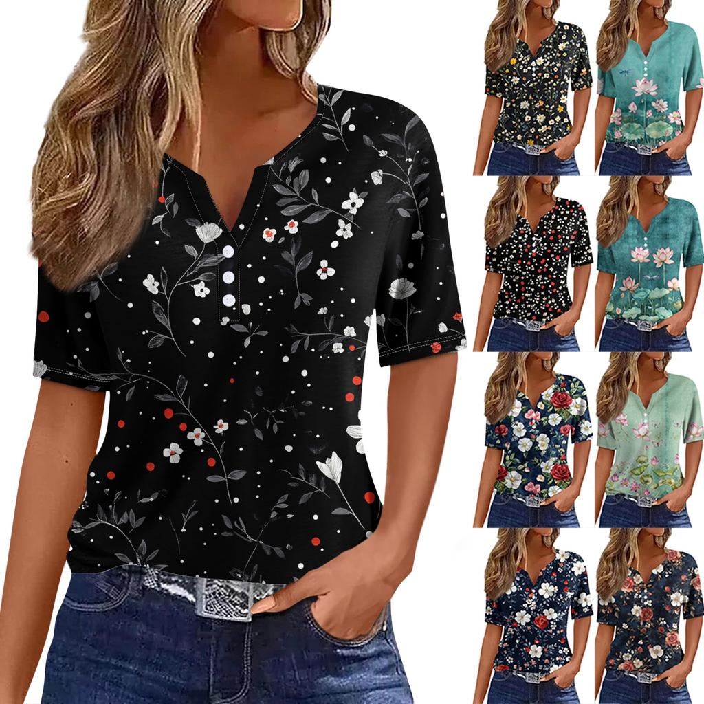 Tricou de damă Tricou imprimat cu buton cu mânecă scurtă, zilnic, la modă de weekend, de bază, cu decolteu în V, obișnuit