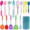 Set Ustensile de Bucătărie din Silicon - Mânere din Oțel Inoxidabil, Spatulă Perforată, Lingură, Tel, Clești și Altele cu Suport Elegant