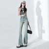 Pantaloni clopot damă de primăvară noi, cu talie înaltă, subțiatori, elastici, albastru antic, cu cataramă dublă