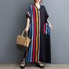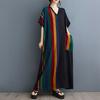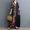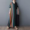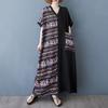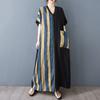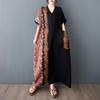 Summer Thin Cotton and Linen Printed V-neck Dress Women's Contrast Stitching Long Skirt