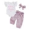 Baby Girls Summer Outfits Short Sleeve Letter Print Romper with Leopard Pattern Belted Pants and Headband