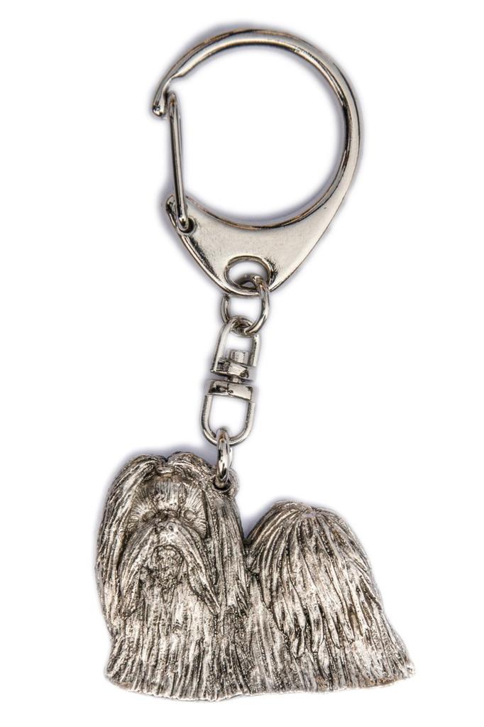 This is an elaborate and antique-looking metal (alloy, antique silver finish) dog key chain made by Alden Arts, a British manufacturer with over 50 years of history and tradition.