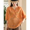 DIMANAF 2025 Summer Plus Size T-Shirt Women Embroidery Short Sleeve V-Neck Vintage New Loose Tops Tees Maxi