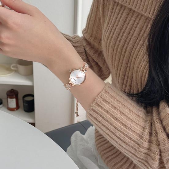 Ceas elegant de damă din aliaj: Fabricat cu precizie, acest ceas se mândrește cu un cadran rotund elegant care emană eleganță și rafinament.. Strasurile colorate și ornamentele cu perle artificiale de pe brățara subțire adaugă o notă de frumusețe și farmec oricărei ținute.