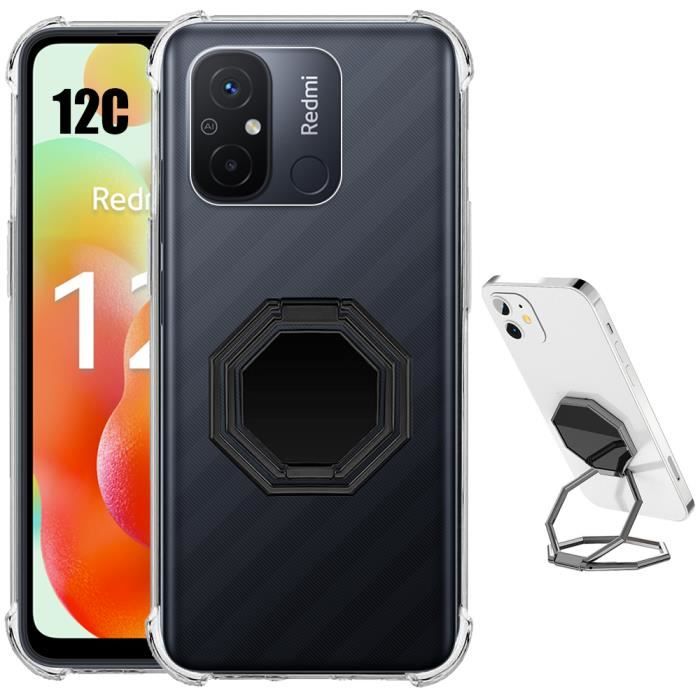 Coque pour Xiaomi Redmi 12C - Silicone Transparent - Support Anneau Réglable - Noir - Souple - Lisse