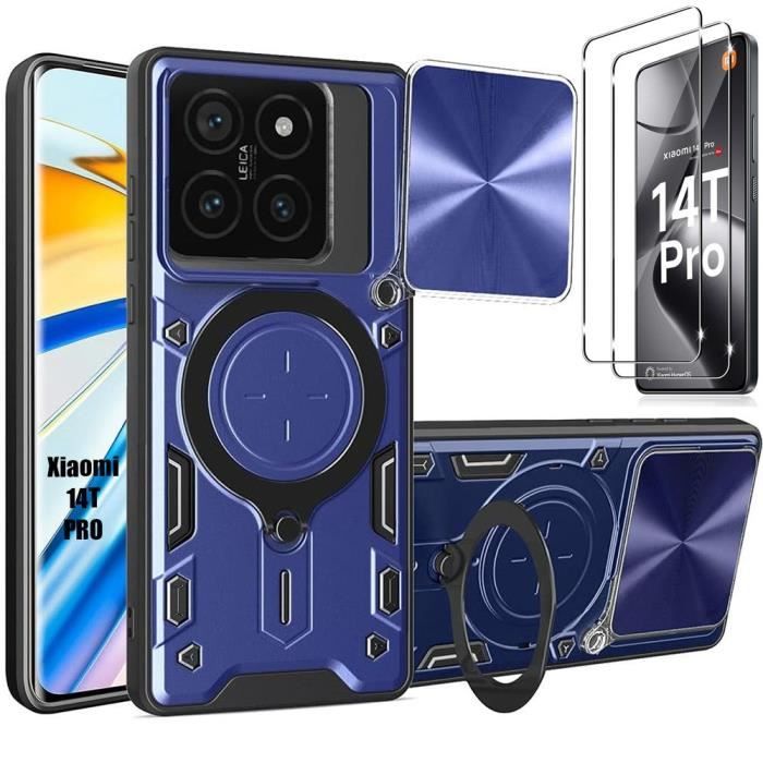 Coque pour Xiaomi 14T Pro, Bleu Marine Anneau Support Cache Caméra Coulissant+ 2 Verres Trempés