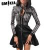 GMXIA Rochie Mini din Piele Ecologică cu Dantelă, Mâneci Lungi și Fermoar pentru Femei