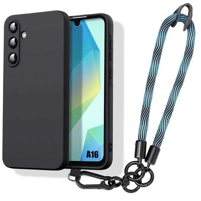Coque pour Samsung Galaxy A16 5G/4G, Protection Antichoc Silicone Noir avec Dragonne Amovible Bleu