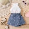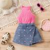 Set de fete la modă 2025 vara copiilor casual de culoare solidă, fără mâneci, bluză din denim cu imprimeu de inimă, pantaloni scurți, set de 2 piese