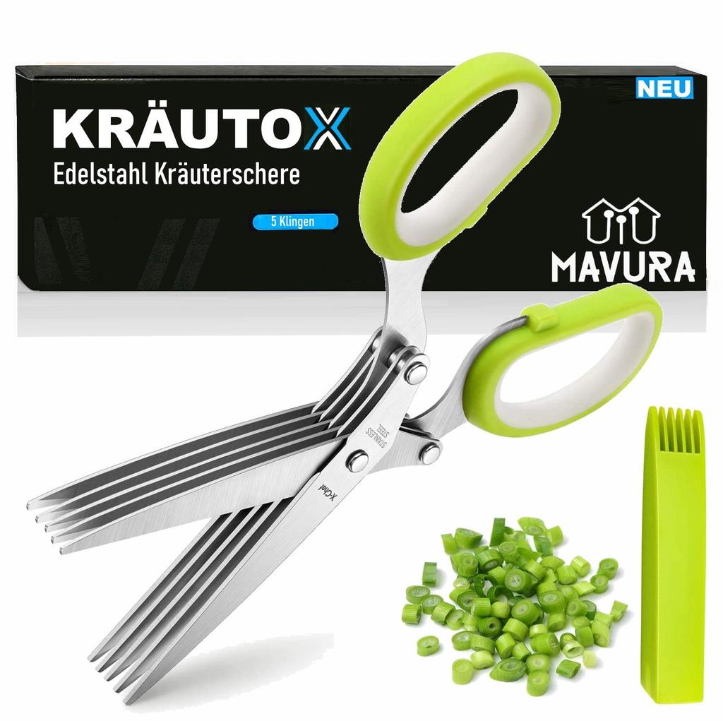 Foarfecele inteligente KRÄUTOX de la MAVURA au 5 lame paralele din oțel inoxidabil de înaltă calitate! În acest fel, puteți obține de 5 ori mai multe resturi vegetale cu o singură tăiere.. Inteligent: Pentru curățare, folosiți pur și simplu capacul practic.