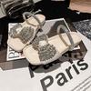 2024 new European flat-bottomed bow rhinestone slippers women's cross with satin open-toed fashion outer slippers