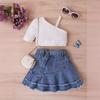 Costum de vară pentru fete, Top cu mânecă scurtă de culoare uni pentru copii, Fustă scurtă plisată din denim, Costum cu curea