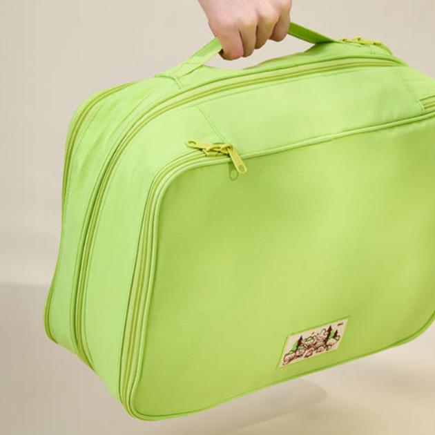 Personajul BT21 Mini Scout iese în evidență, și este conceput cu o structură care poate organiza ordonat diverse articole esențiale de călătorie, cum ar fi lenjeria intimă, șosetele, cosmeticele și încărcătoarele.