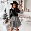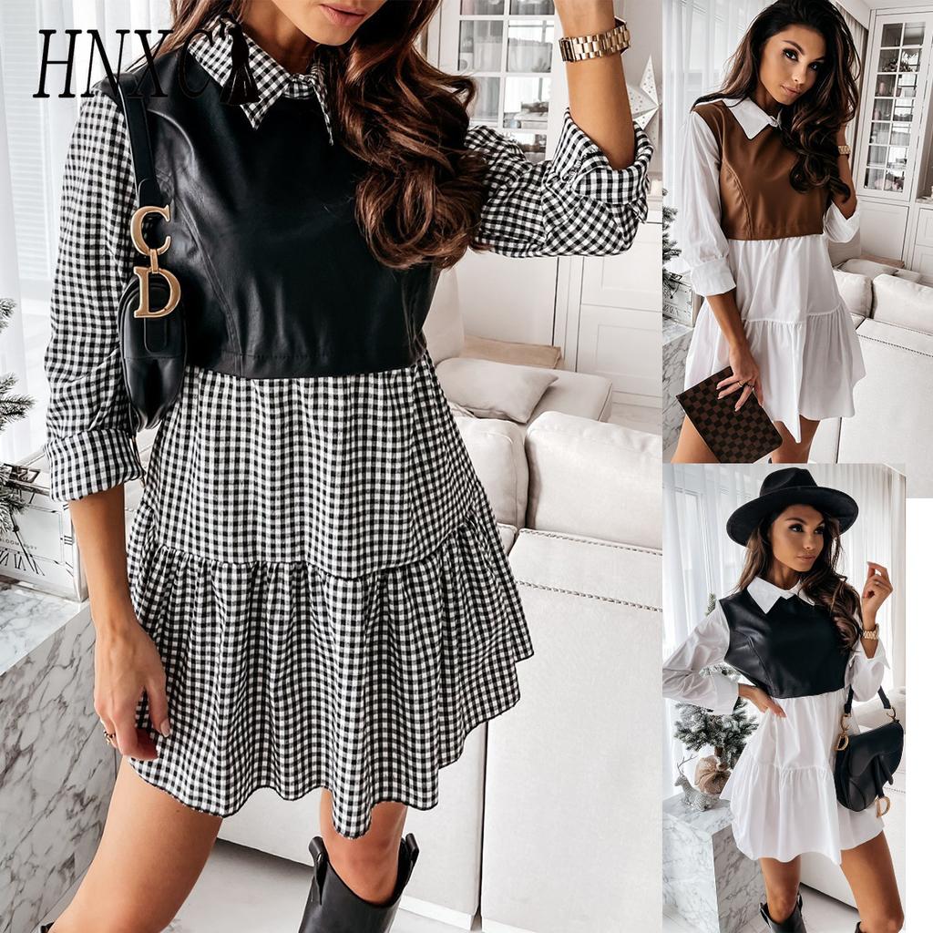 HNXC Rochie de piele pentru femei la modă, patchwork carouri, mini rochie de petrecere casual, fustă de primăvară cu volane