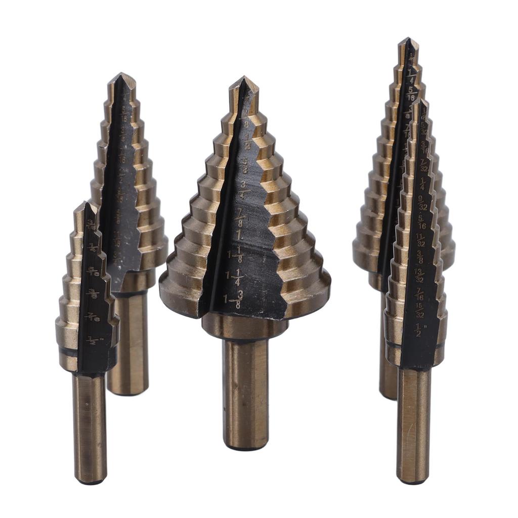 5 x Burghiu Treaptă Set 5 Bucăți: Acest set de burghie treaptă include 5 piese, cu specificații variind de la 14in la 1?38in, 316in la 78in, 14in la 34in, 18in la 12in, 316in la 12in, oferind versatilitate pentru diverse nevoi de găurire.