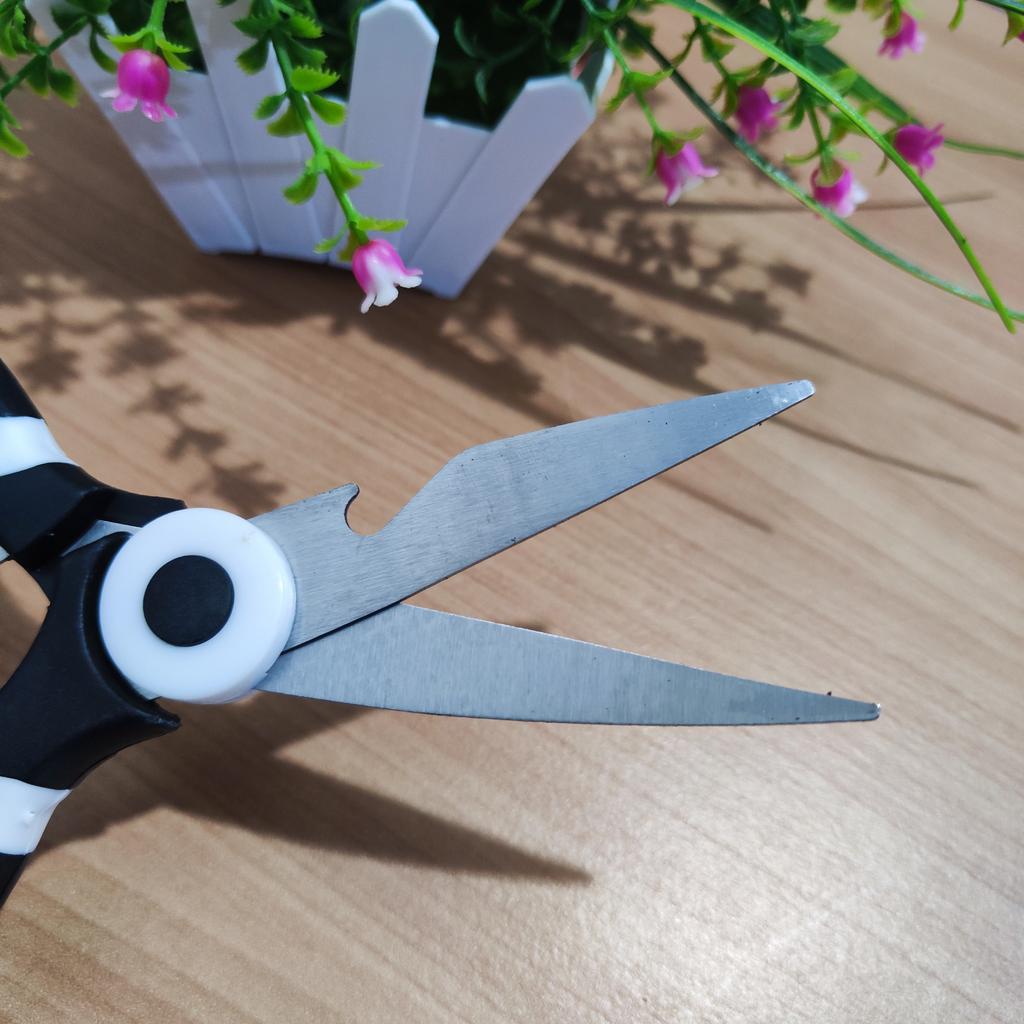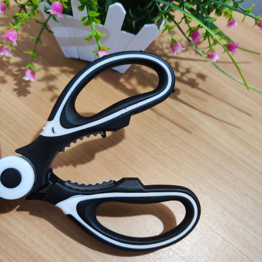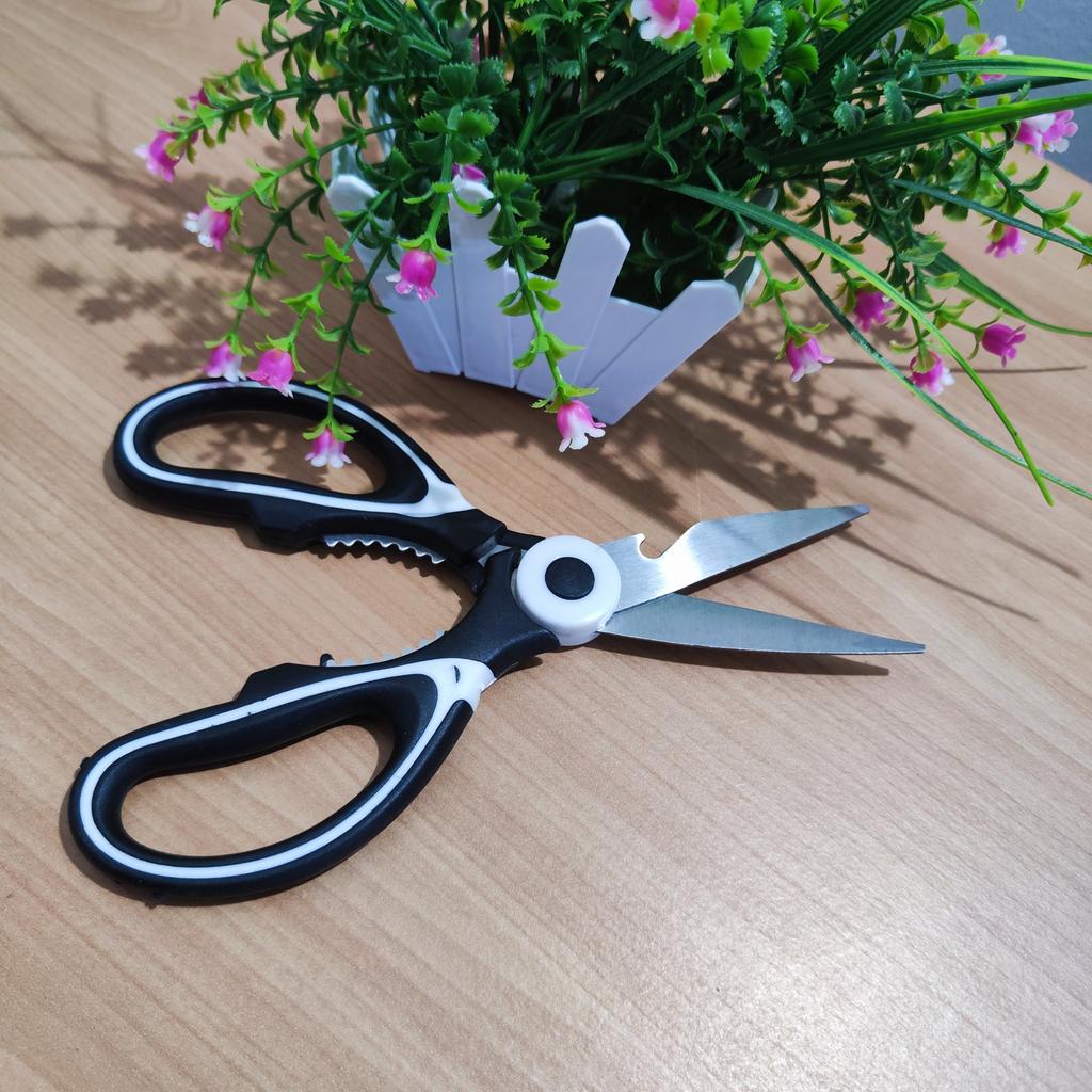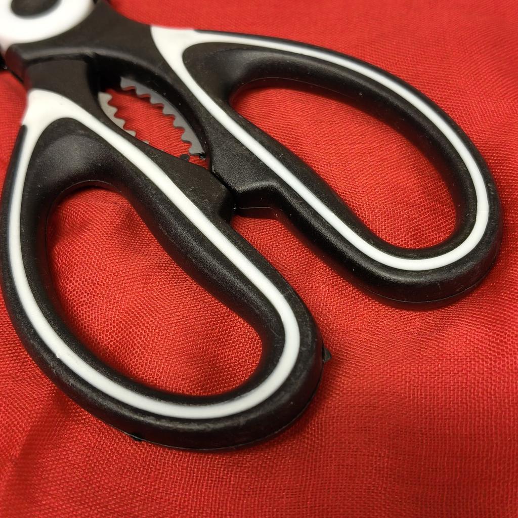 Foarfece multifuncționale pentru bucătărie – un instrument obligatoriu în orice bucătărie Acești foarfece surprind prin calitate și putere! Lamele din oțel inoxidabil foarte puternic fac față fără probleme tăierii oaselor de pui, legumelor dure și altele.. Mânerul este confortabil de ținut chiar și când este folosit pentru o perioadă lungă de timp, iar faptul că are și un deschizător de sticle și un spărgător de nuci încorporate este pur și simplu genial – economisește spațiu și ustensile de lucru. Lucru precis, ușor de curățat și calitate pe care o simți în mână. Recomand tuturor celor care doresc un ajutor de bucătărie fiabil și puternic.