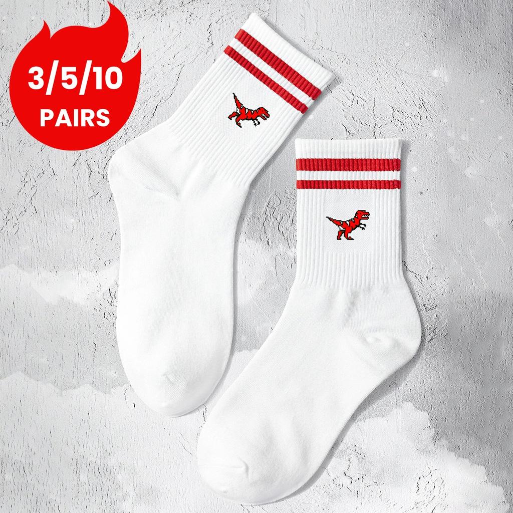 Multiple Pairs of Men's Crew Socks with Dinosaur Patterns, White, Unique, Comfortable, Breathable, Moisture-Wicking