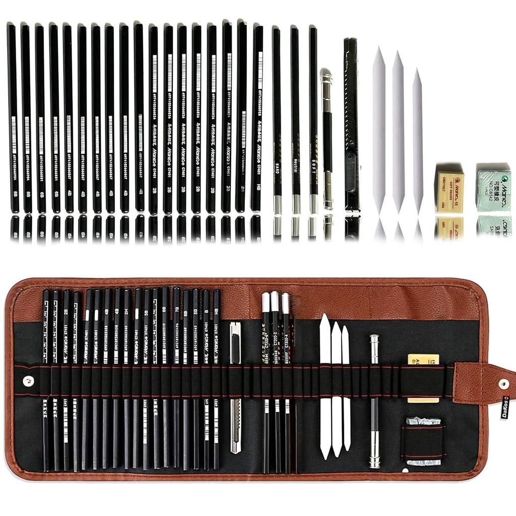 Set de instrumente profesionale pentru schițe și desen, 29 de bucăți, cu creioane din grafit, creioane cu cărbune, stilou șters de hârtie, (cu husă rulantă din pânză)