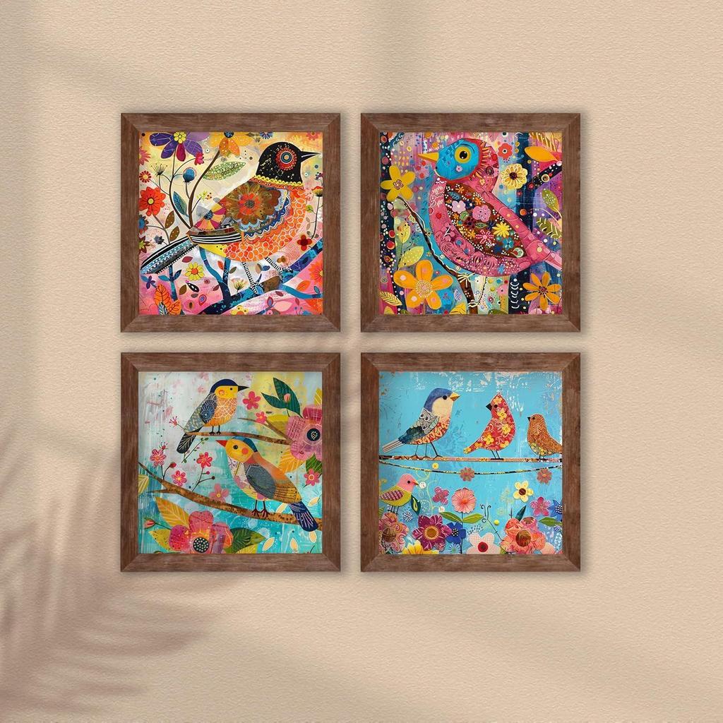 Impresii de Artă Murală cu Păsări și Flori Colorate, Designuri Botanice Vibrante cu Picturi cu Păsări Exotice pentru Decorul Casei și Biroului (9x9 Inci, Set de 4)