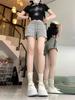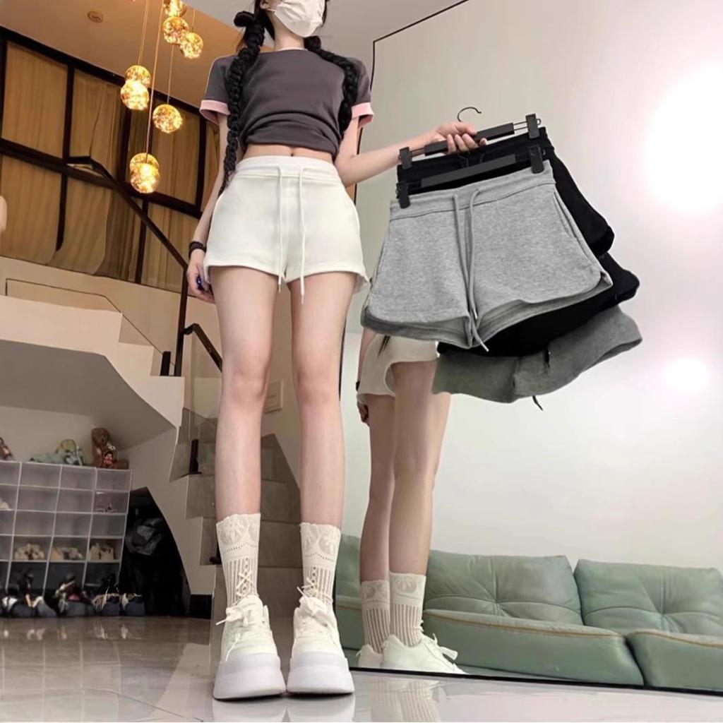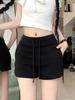 Women's Spicy Girl Black Drawstring Casual Shorts: Autumn Elastic Waist, Slit Straight Leg, Solid Color Fashion.