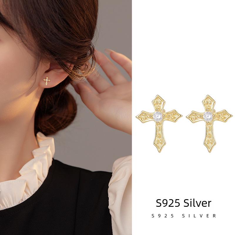 S925 Korean Silver Zircon Cross Earrings - Single Diamond, Personal and Simple Design