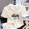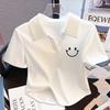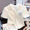 Polo de damă alb din bumbac cu gât în V franțuzesc, umeri drepți și mâneci scurte