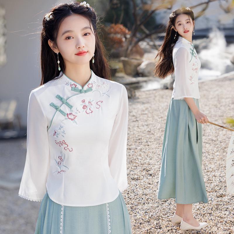 Republic of China Style Women's Retro Embroidered Cotton-Linen Hanfu Zen Tea Suit