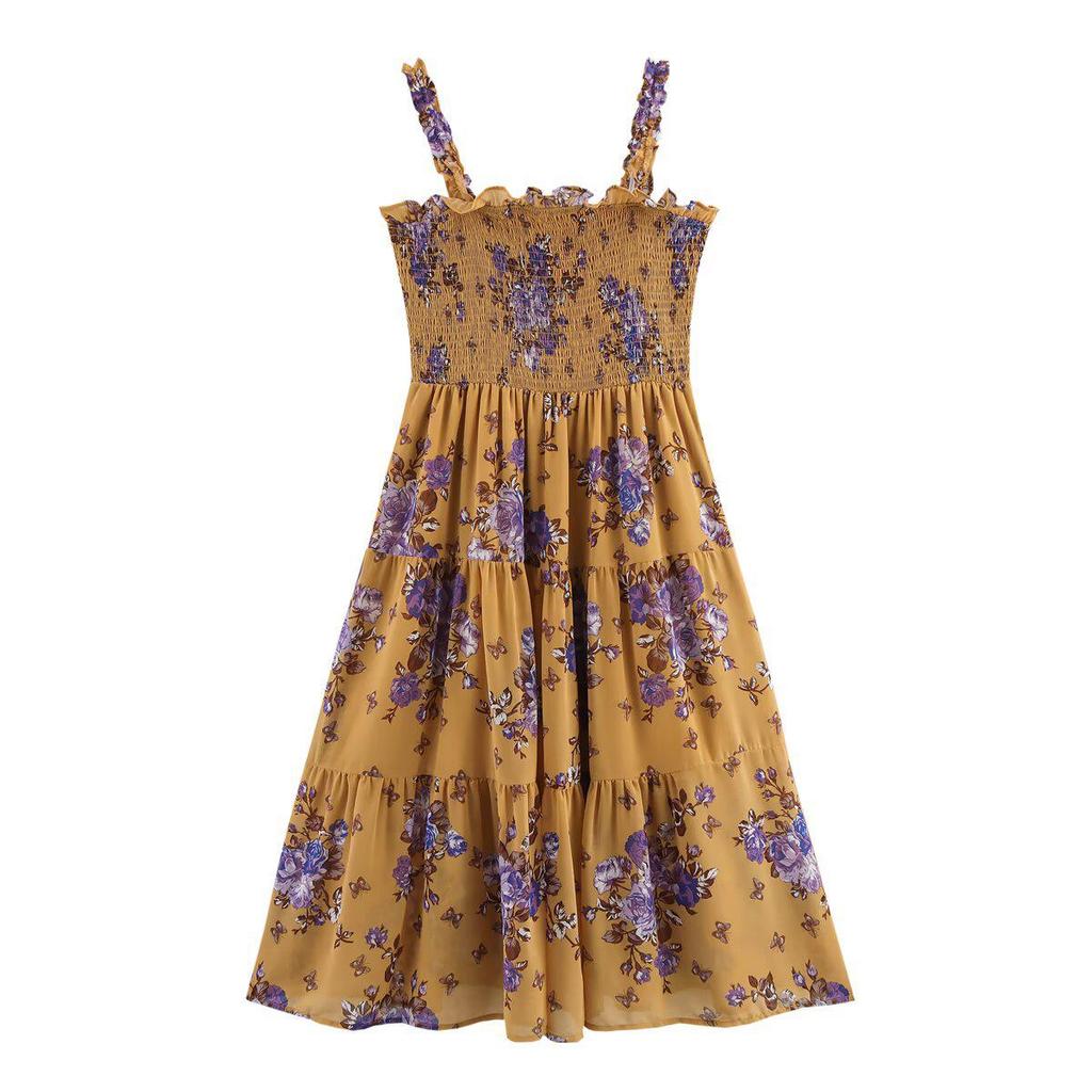 Spring 2025 European & American Style Women's Chiffon Print Waist-Gathering Sling Dress