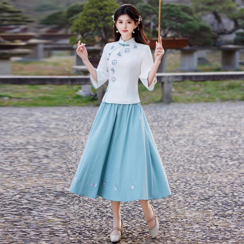 Acest top elegant este un amestec de măiestrie tradițională și stil modern, prezentând un guler înalt inspirat de moda chinezească retro.. Fabricat dintr-un amestec respirabil și confortabil de bumbac și in, oferă o senzație ușoară, perfectă pentru climatele mai calde.. Partea superioară este frumos împodobită cu broderii complicate, adăugând o notă de sofisticare și bogăție culturală oricărei ținute. Ideal pentru ocazii atât casual, cât și semi-formale, oferă o opțiune unică și elegantă pentru cei care doresc să îmbrățișeze moda culturală cu o notă contemporană.